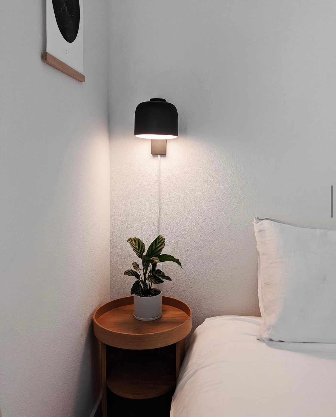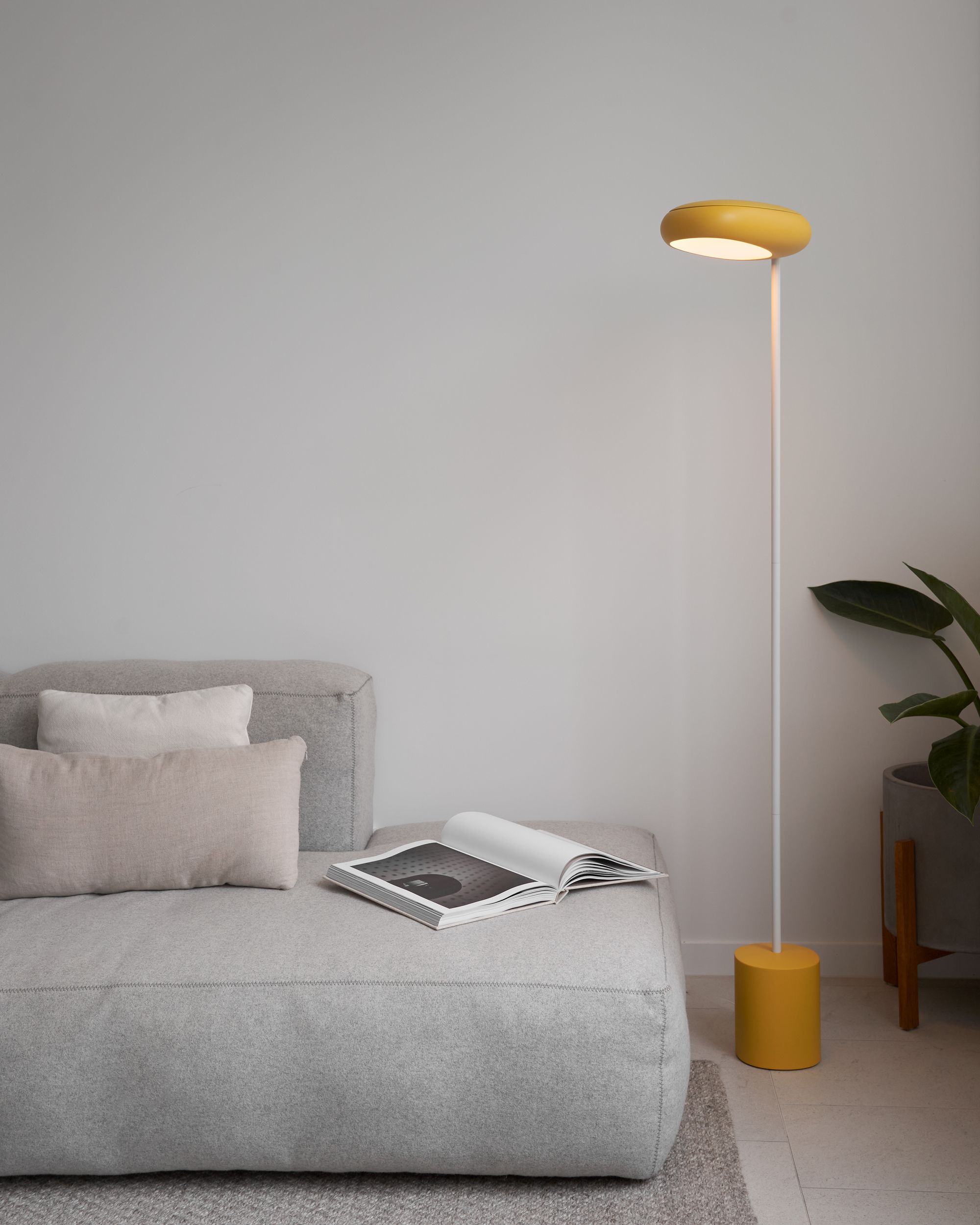 You can also help this process along by choosing pieces with minimal footprints to free up as much space as possible. A sleek fixture like Palm Floor Light can fit into a tiny corner, keeping your living space open and full of soft, diffused light. Alternatively, adding two Gio Wall Lights above your bed can free up your bedside tables, simplifying your minimalist aesthetic look.