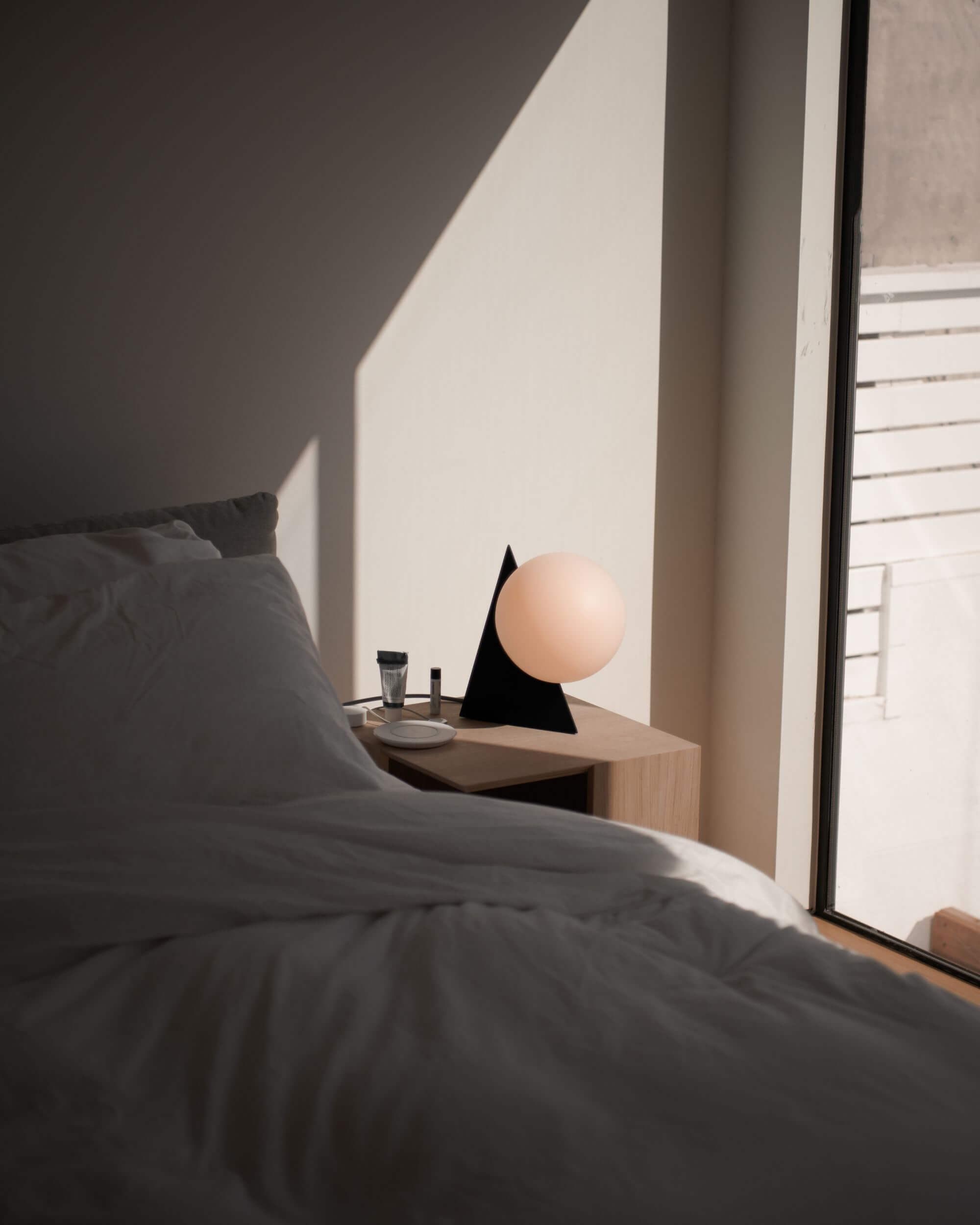 The right nightstand light is proportional. Newer designs include conical, pyramidal, cylindrical, or spherical shapes that are nearly as wide as they are tall, minimizing the chance they might be knocked over. Gantri styles like the Maskor Table Light and Cantilever Table Light offer innovative shapes in smaller sizes, making them the perfect style for most bedrooms. The perfect nightstand light offers soft, warm light that provides atmosphere when spending time with a partner and allows for late-night reading without waking them. Nightstand lights should also be flattering, offering enough light to perform certain activities without washing you out with harsh, bright light. Because nightstand lights are typically positioned next to beds, which have lots of linens, quilts, pillows and other flammable textiles, the bulbs should ideally be cool to the touch and as fire-safe as possible.